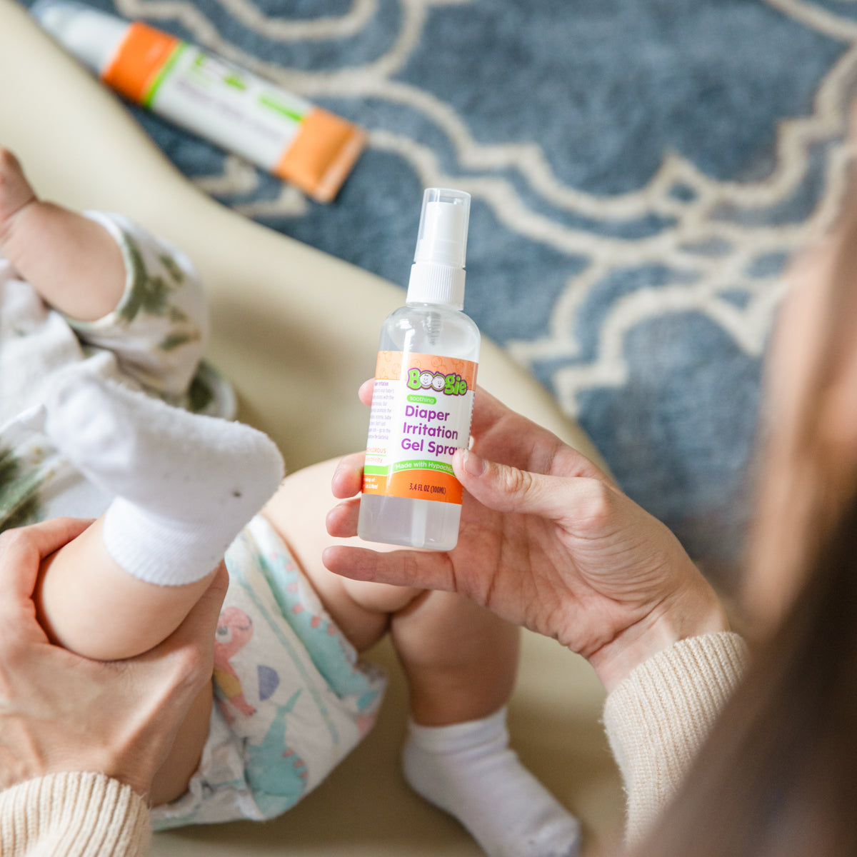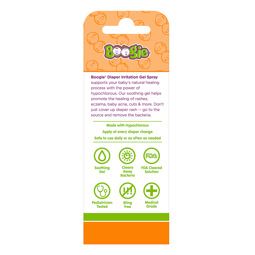Boogie® Diaper Irritation Gel Spray is a soothing daily gel spray that supports your baby's natural healing process with the power of hypochlorous (HOCl). This FDA-cleared solution is medical grade, sting free and safe to use as often as needed.
