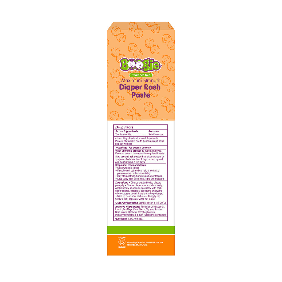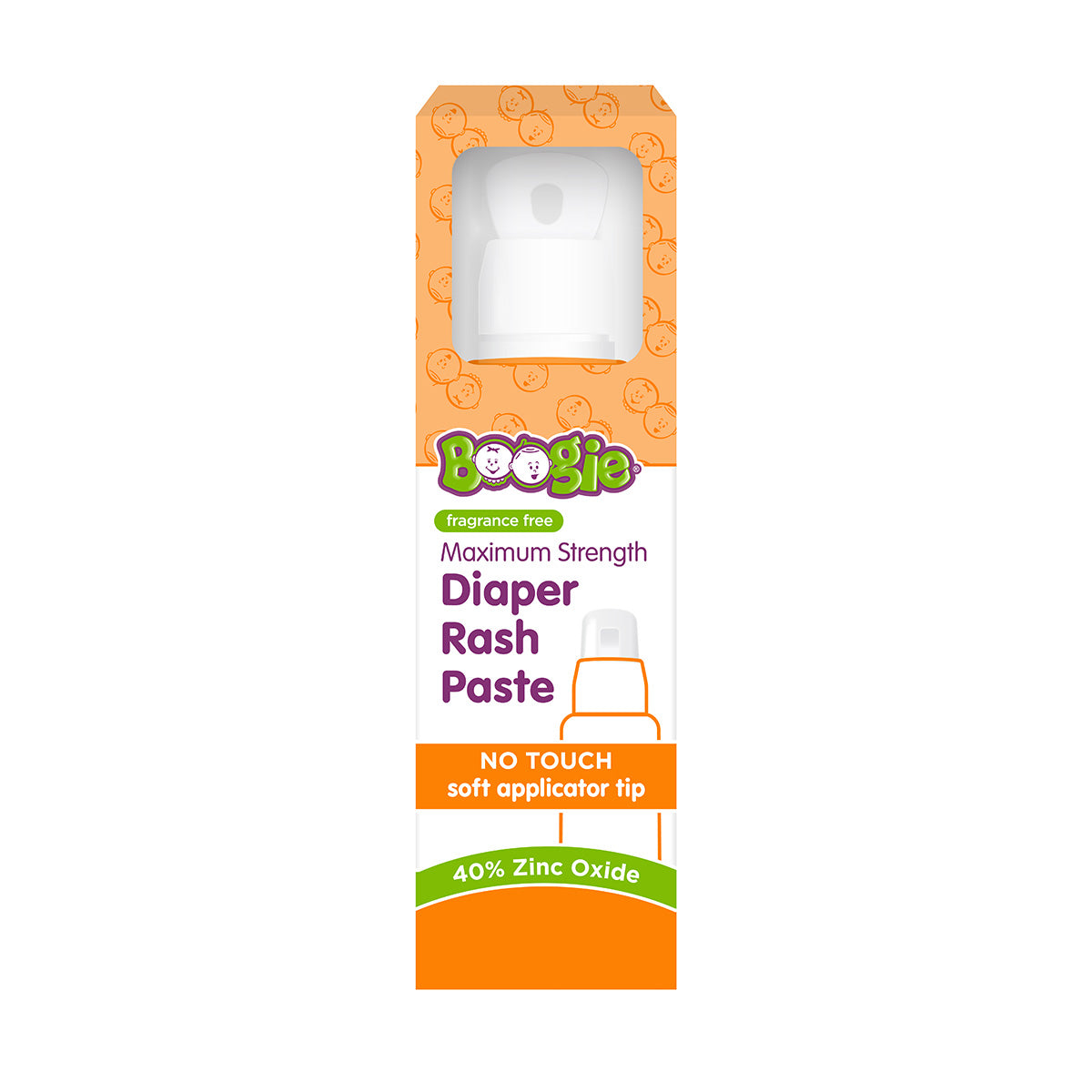 Boogie® Maximum Strength Diaper Rash Paste is a creamy, soothing diaper rash cream designed to help treat and prevent diaper rash – with no mess! Made with 40% zinc oxide, its soft, no touch applicator tip is fast and easy to use with one hand. Just squeeze and apply! BPA free and free from parabens, dyes, and talc and safe for all ages.