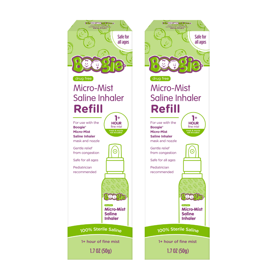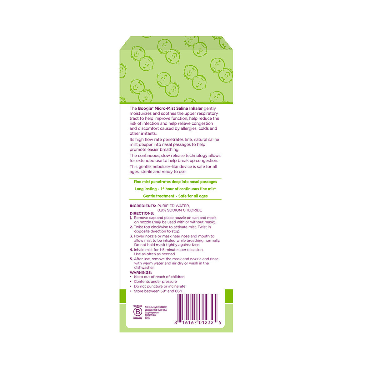 The Boogie® Micro-Mist Saline Inhaler is the first of its kind. It’s designed to help relieve congestion and discomfort, moisturize and soothe the upper respiratory system by distributing natural, sterile saline micro-mist particles along the airways. Also, its high flow rate and slow release technology penetrates the drug-free mist deeper into nasal passages.