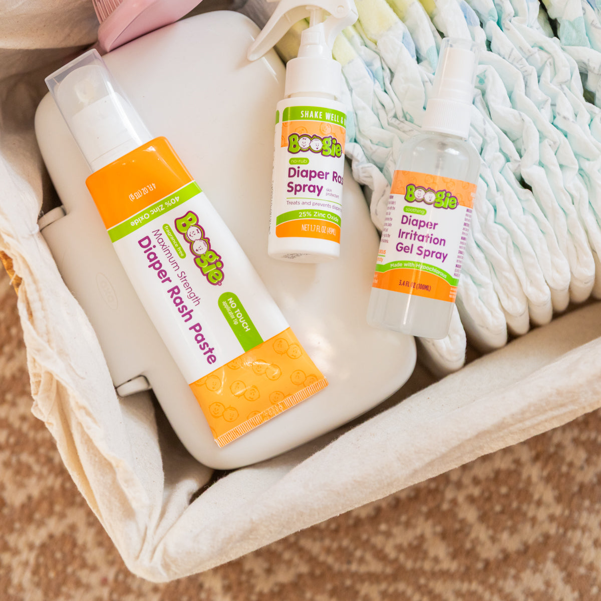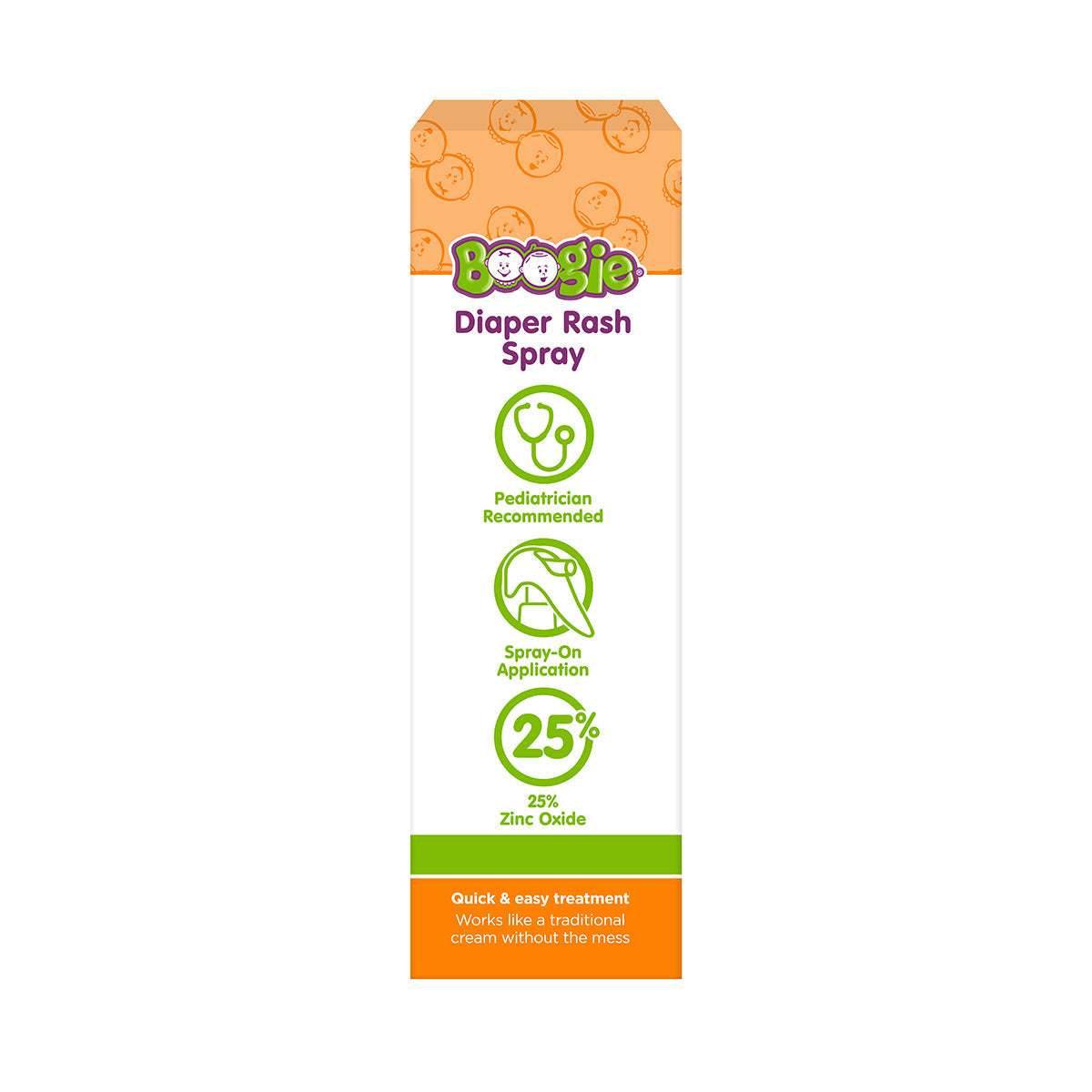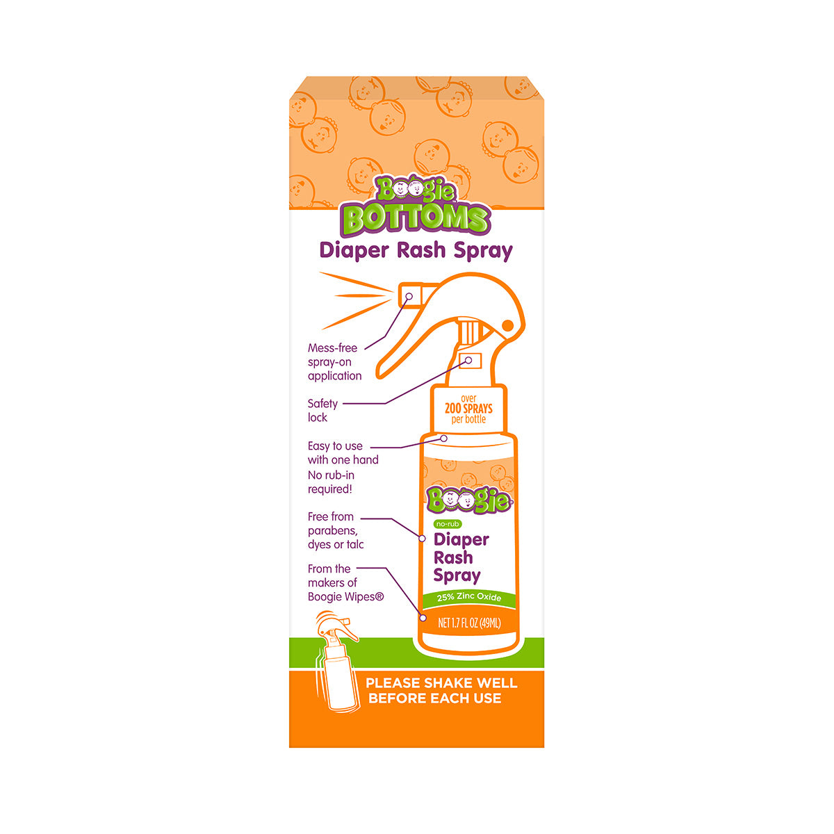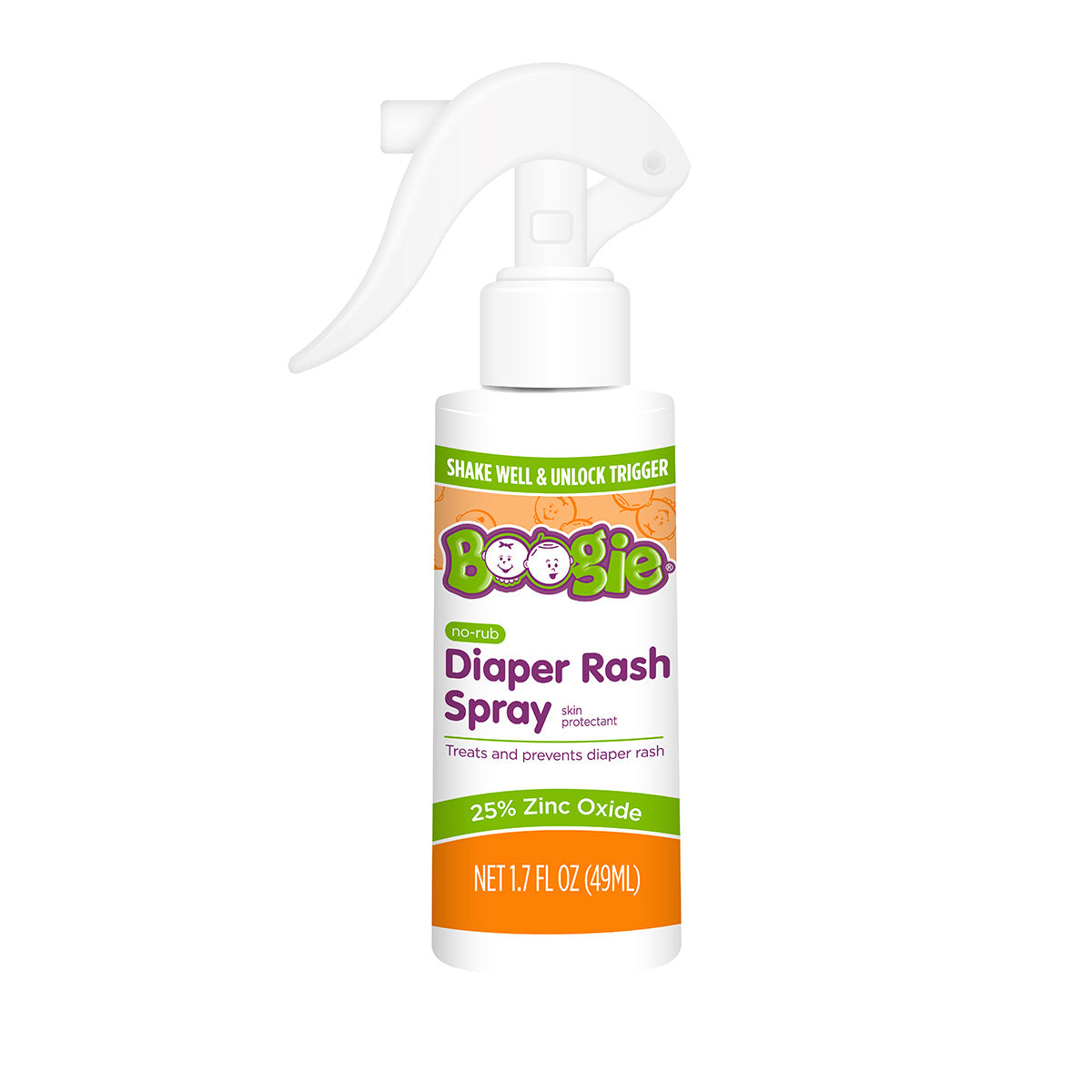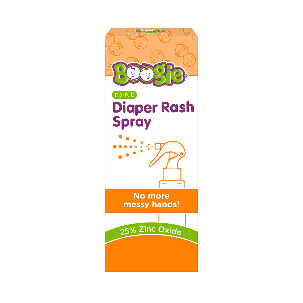 Boogie® No-Rub Diaper Rash Spray is a creamy, soothing diaper rash cream designed to help treat and prevent diaper rash – with no mess! Its spray-on application is fast and easy to use with one hand. Just spray and soothe!