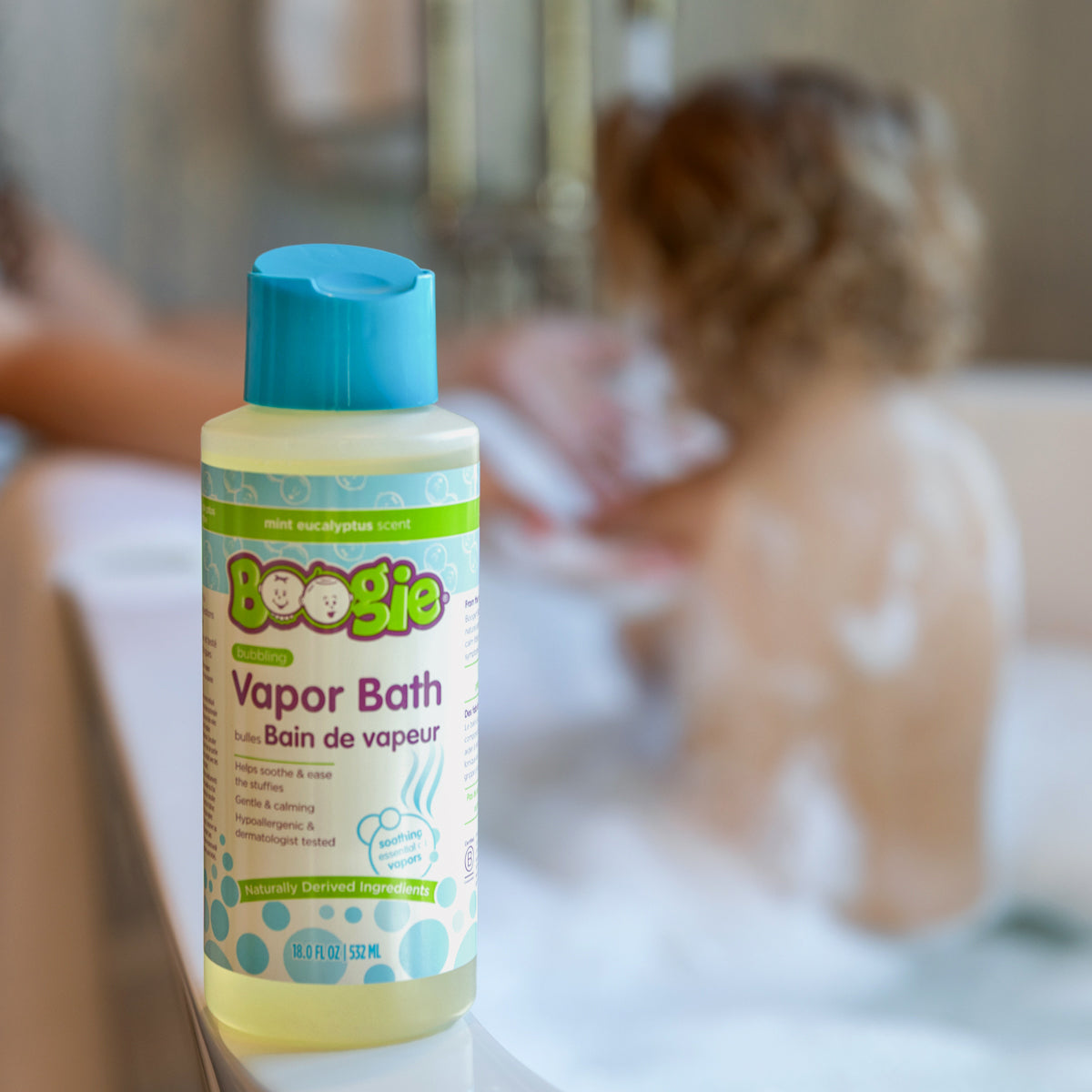 Make the most out of bathtime with Boogie® Bubbling Vapor Bath — it helps soothe, comfort and relieve your little one when congestion, cold, flu and allergy symptoms are at their worst. Our gentle, soothing and naturally-derived bubble bath releases boogie-busting vapors and is made with safe dilutions of eucalyptus and peppermint essential oils and without menthol, parabens and phthalates. It’s hypoallergenic, dermatologist tested and washes away cleanly.