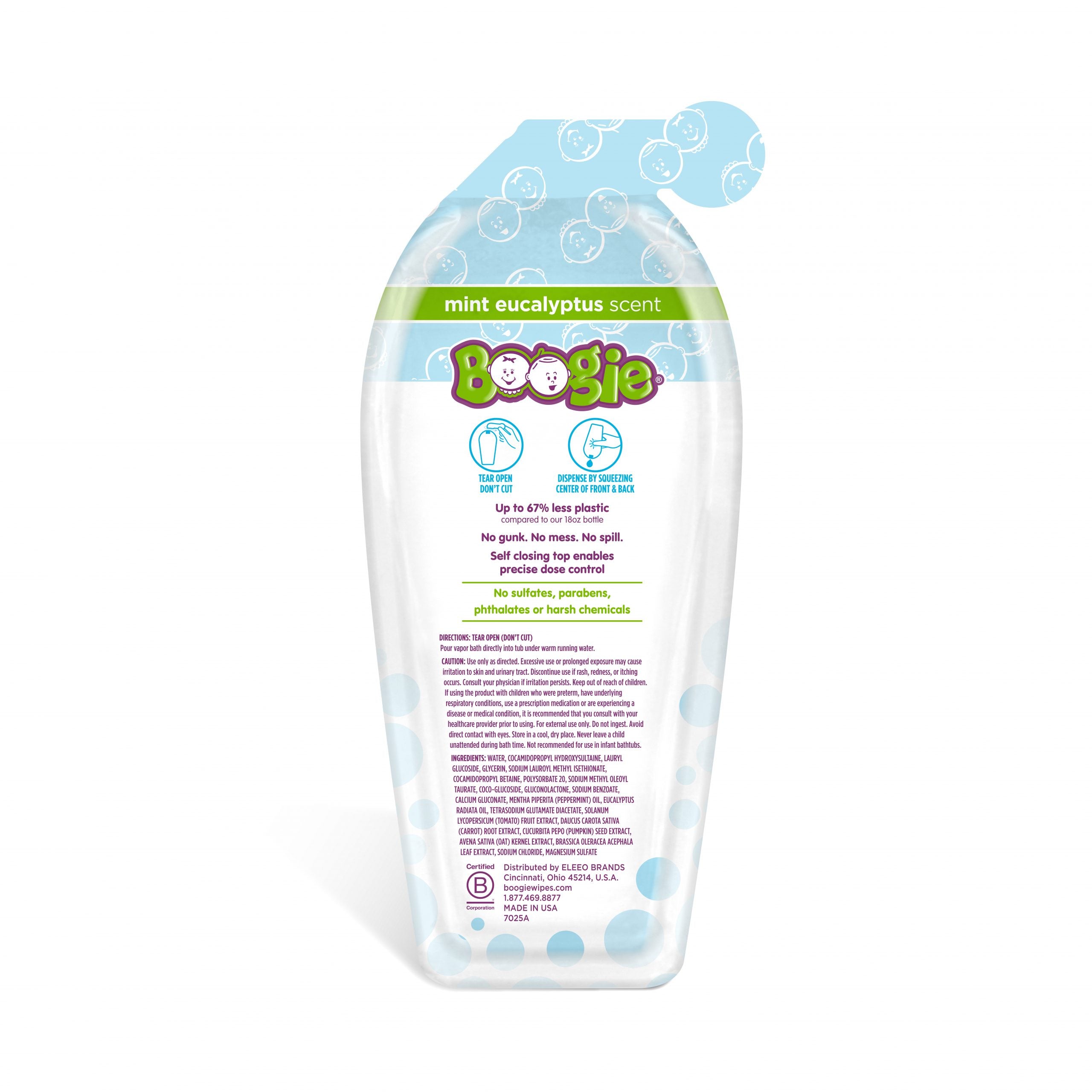 Boogie® Bubbling Vapor Bath is available in 3 sizes: 10oz, 16oz and 18oz. The 16oz bottle is a spill-resistant pouch with a self-sealing top that doesn’t leak, even when dropped. It is made with 67% less plastic than our 18oz bottle and recyclable. Even better? It floats for extra bathtime fun!