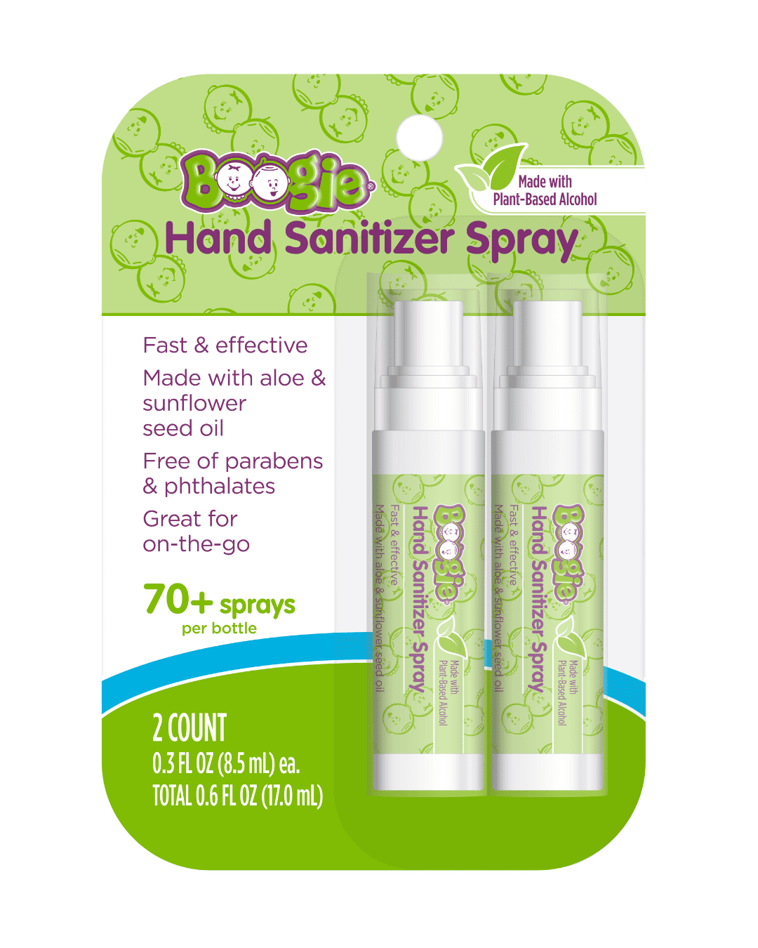 Boogie® Hand Sanitizer Spray is a fast and effective way to decrease bacteria on hands and body when soap and water are not available. Made with plant-based alcohol, aloe and sunflower seed oil, and free of parabens and phthalates, Boogie® Hand Sanitizing Spray can be easily thrown into the car, purse or bag for life on-the-go. Available in a two-pack or three-pack so you always have a bottle handy.